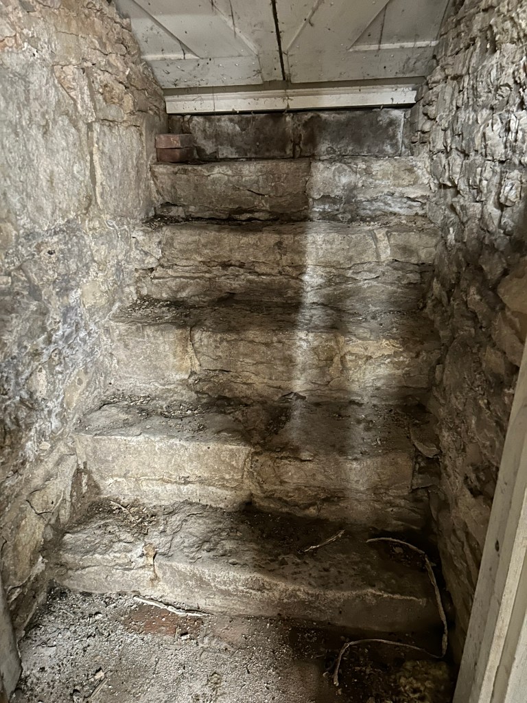 We then take our guests down into the cellar. Here it gets a bit more interesting. The whole basement has been plastered so it does not look at all 1845’ish. We do show them the original limestone fireplace foundation and they all think that this is so cool. Then our final “Wow” is the stairs that exit up from the basement to the world above (and I think I’ve shared a photo of this in a previous blog). The steps are the original limestone – as are the rocks that line the sides. Folks always get a kick out of getting a photo of themselves coming up out of the cellar (with the photo being taken from up top, and looking down).