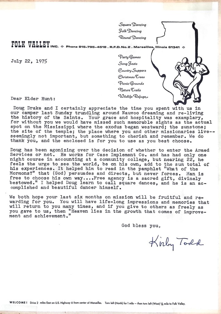 On April 25, 1975, I recorded in my journal: “It has been an interesting day. All of us in the office received word on forthcoming transfers My transfer was a real mind blower. I will leave May 10th – along with Elders Moffat, Howard, and Rich, to go to the Nauvoo, Illinois Mission. I will spend the rest of my mission there. This means that I will have been here in Florida [Alabama and Georgia] for exactly 18 months. I am really excited about this. I have felt sure (by the Spirit)- that I would get there sometime. I heard parts of the phone call to President Spencer H. Osborn on Wednesday. He received a call from President [J. LeRoy] Kimball of the Nauvoo mission. Two seconds later, after he hung up, he called his Assistants into his office. I’ve known since then that something was up. We already had a transfer in progress for the week.”