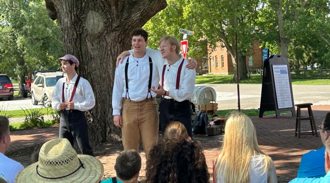 Today, we talk of the group in two of our presentations. One is at the “singing tree” where the Nauvoo Performing Missionaries (NPM’s) perform. There is a giant tree in Nauvoo. It is at the corner of Main Street at Kimball Street. Two or three times a day, the NPM’s sing at this tree, and it is so fun to gather there with whoever might then be on Main Street.