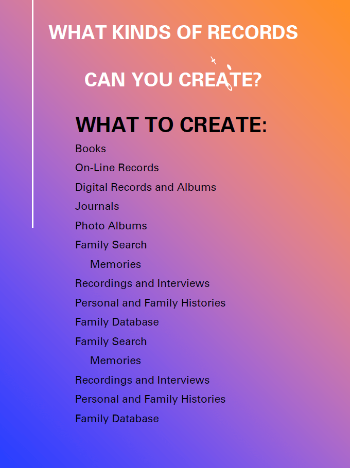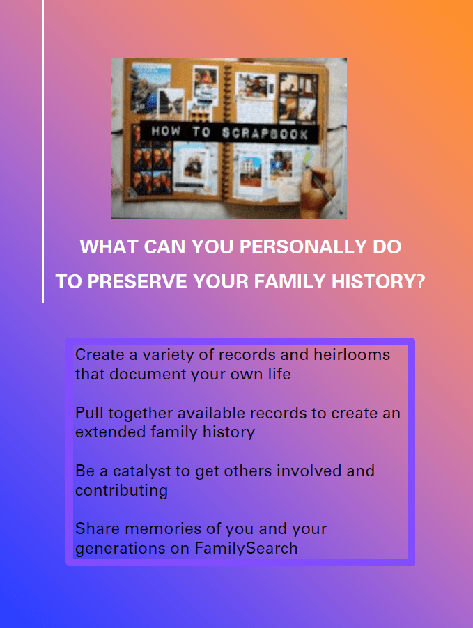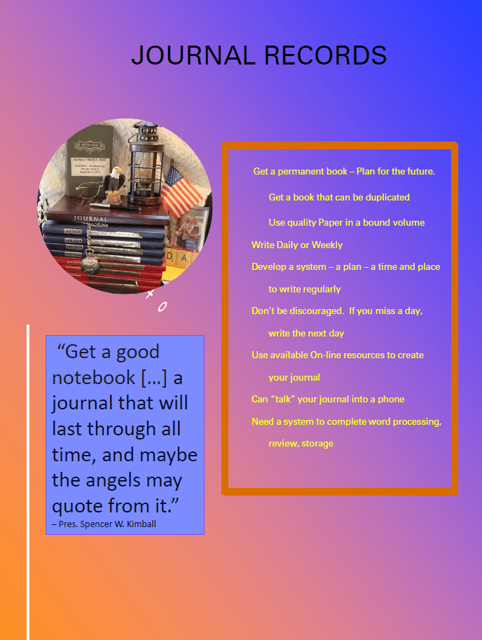 My first class was an introduction to various “records” one can create as family heirlooms. Everyone has a story to share – and the presentation explores many options you can create for yourself, your current family, as well as for your future posterity. It doesn’t matter what you do. Commit to doing something and begin to create and share. I enjoyed putting together a presentation in preparation for my class. And now, I am happy to share it with you.
