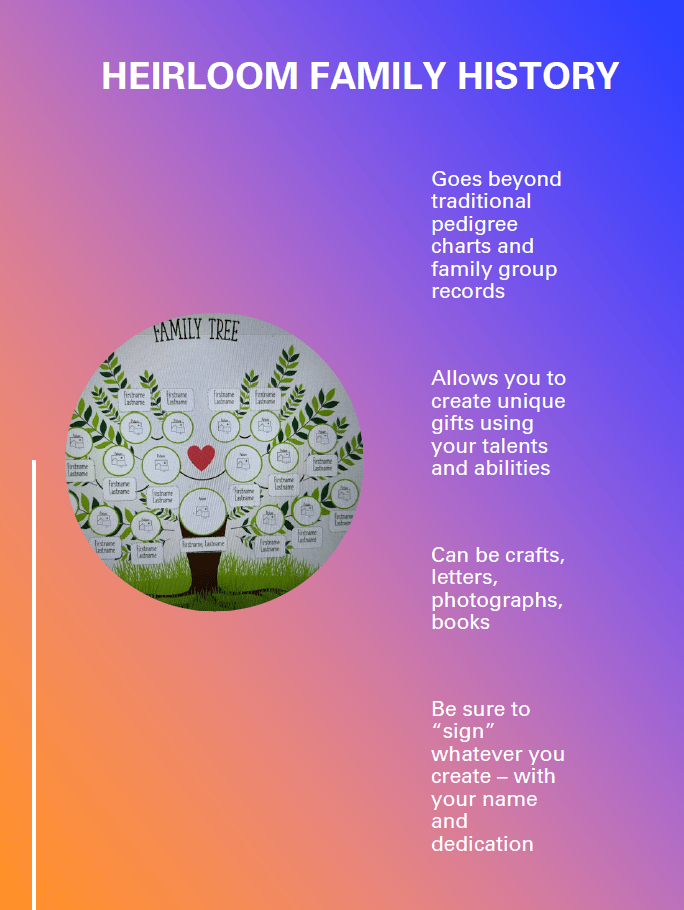 Those who know me, know that I have been into genealogy and family history since I was age 12. I have a bit of experience in family history. I looked for an opportunity to share those talents by teaching a series of classes relative to creating family history, heirloom records, journals, personal and family histories.