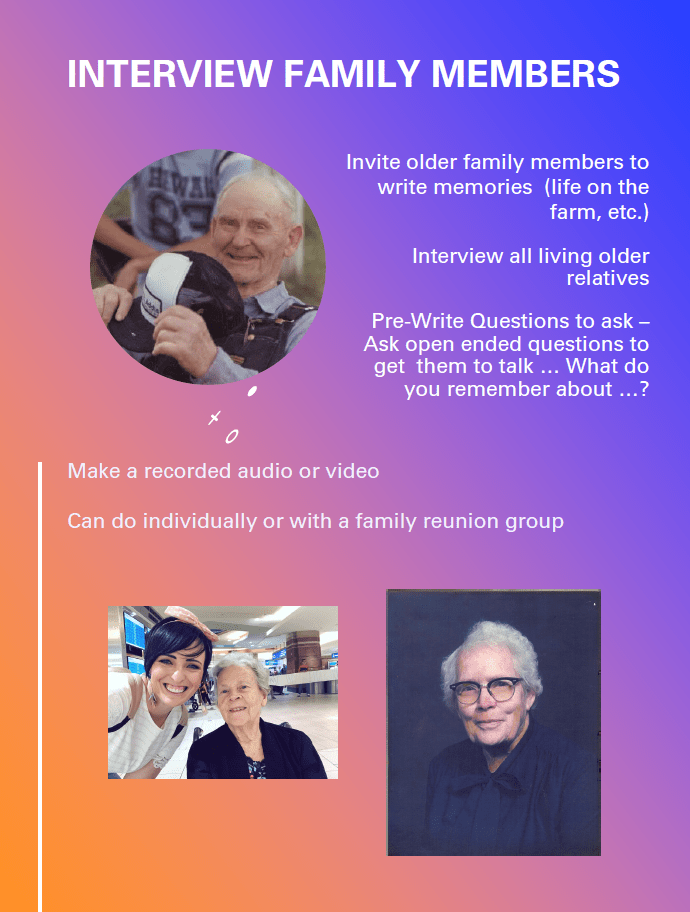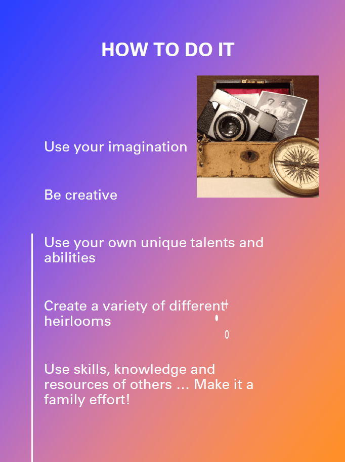 Be creative and have fun! Do it, and your famiy will love you. They will remember you for the way you brought your family together.through the heirloom records that you created for them.