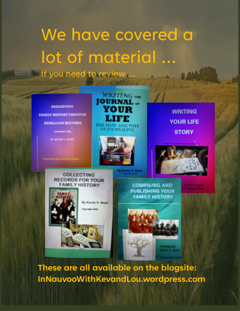This is my fifth and final presentation prepared for a Nauvoo family history series of classes. This presentation will help you ‘compile and Publish your Family History.
