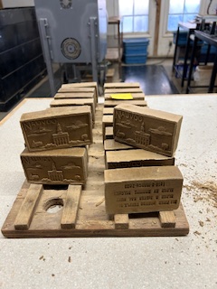 In the Brick Room, we have two hydraulic presses and two sets of the pair of brick molds. And each mold can hold four “pugs” at a time. The operators put the four pugs (each about 4” long and 2” or so in diameter) into the mold. With a linoleum cover, the two metal plates – with the pugs – are put under the jacks. These are then pressed down with great strength and the imprint from the molds are indelibly pressed into the clay pugs – which are squashed down flat into the molds. And since this day was the historic first day of the new brick, there was a desire to create some special bricks to commemorate the special March 9 kiln opening of the very first bricks.