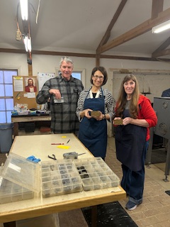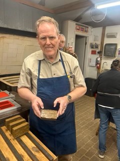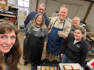 We felt like real printers – as we pulled type and created our personalized design. (A note: We had previously talked with our son-in-law, Michael, about creating such a design, but this whole process of mold creation moved much faster than we had anticipated – and so it was soon way out of the planned ballpark with him. With President Mehr’s “let’s do it” injunction, we were caught unprepared for Michael’s creation – and we felt bad about that!)
