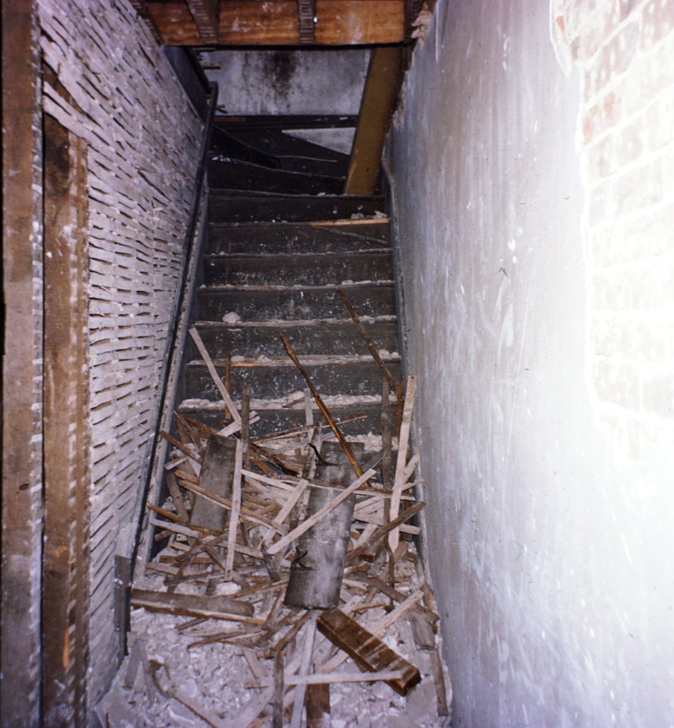 Left: The Clark Store stairs before/during restoration (Photo 1975 by Kevin V. Hunt)