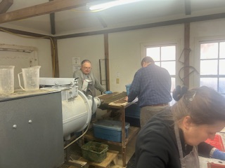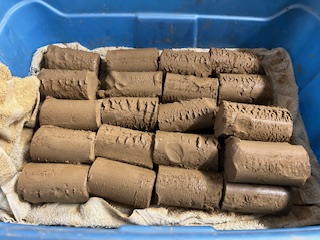On this day, we had one tub that was the right consistency (the right mix of clay/dirt, sand, and water) that was needed. However, the other three tubs with all of their pugs – were not right. The pugs were too hard to press properly. They ultimately had to be “bagged” or deemed unusable. This was a heartbreak. I had never seen this situation before. The pugged clay was not totally unusable – but it meant that we had to recycle it back into the pug machine – with more water added to it.