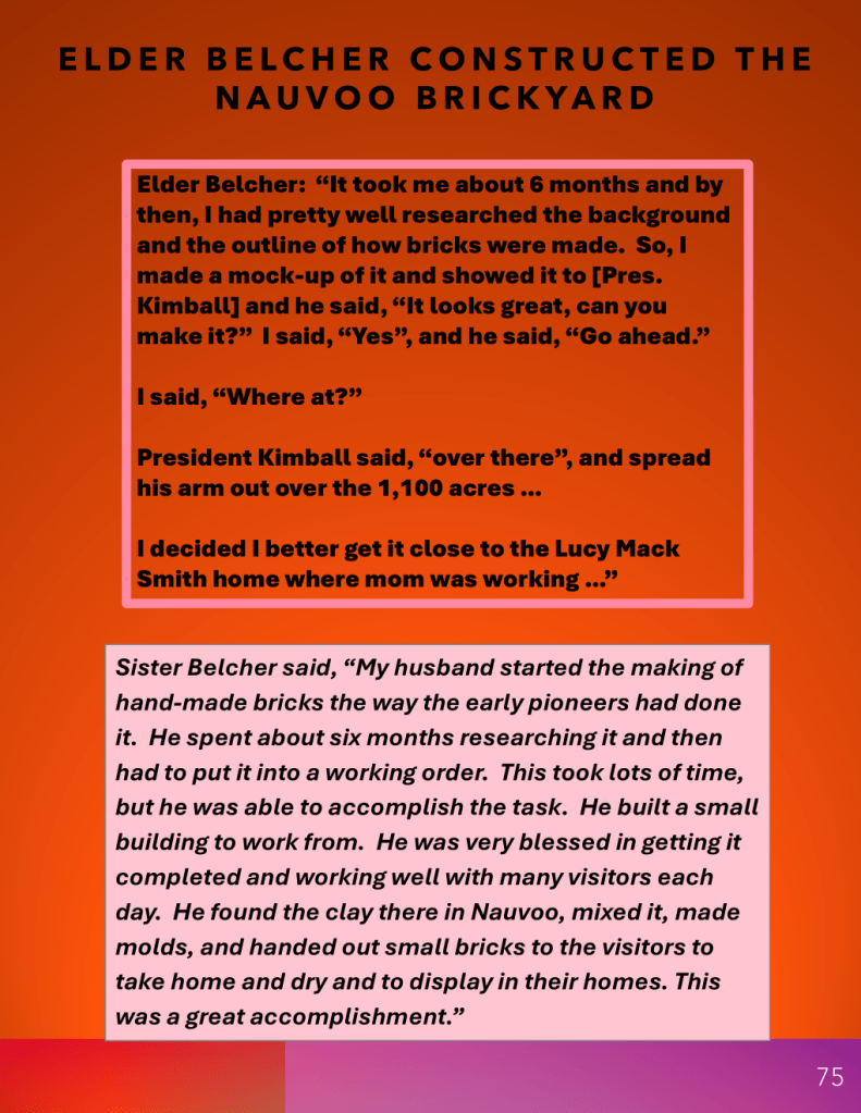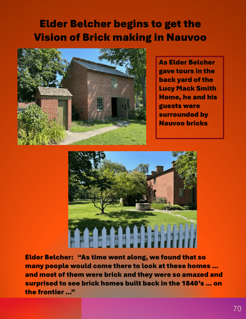 This is all so exciting. What a great tribute to the “Nauvoo Brickmaker”. We are happy that everything came together (though we didn’t plan it ahead) so that Elder Belcher can remembered for his work on the Nauvoo Brick. We are in awe for the many miracles that came together – for the Lord – as everything has come together. It has been such a great blessing opportunity for Sister Hunt and me to be a part of these miracles. And thus, the Belcher Brick Legacy continues.