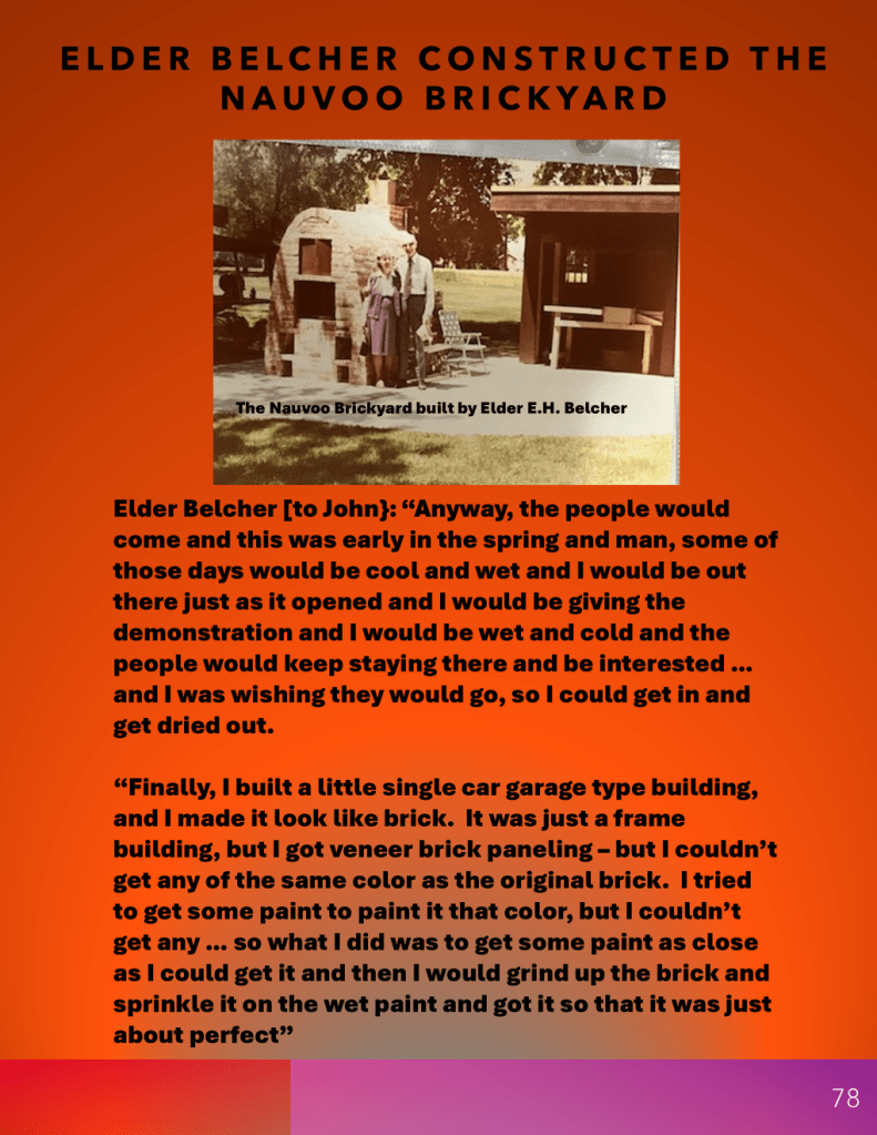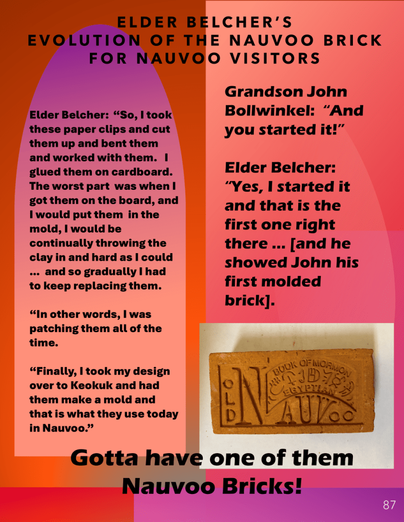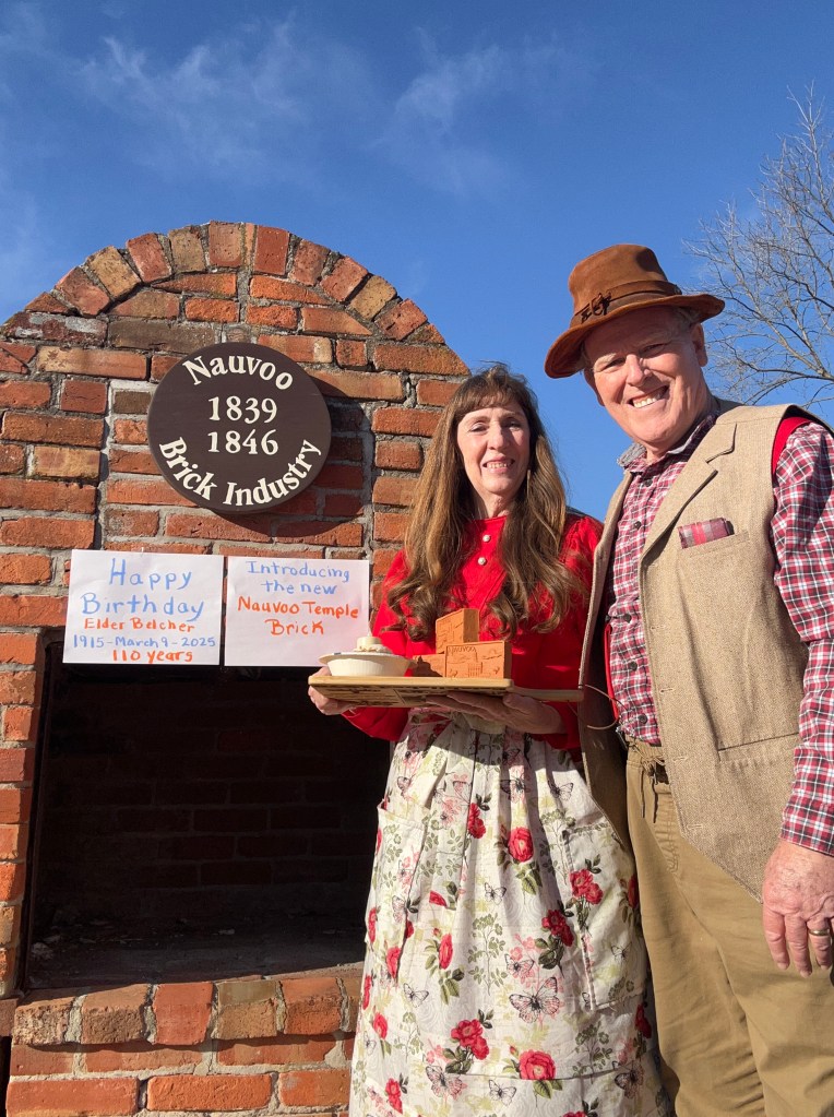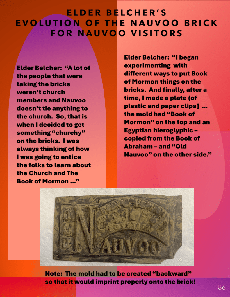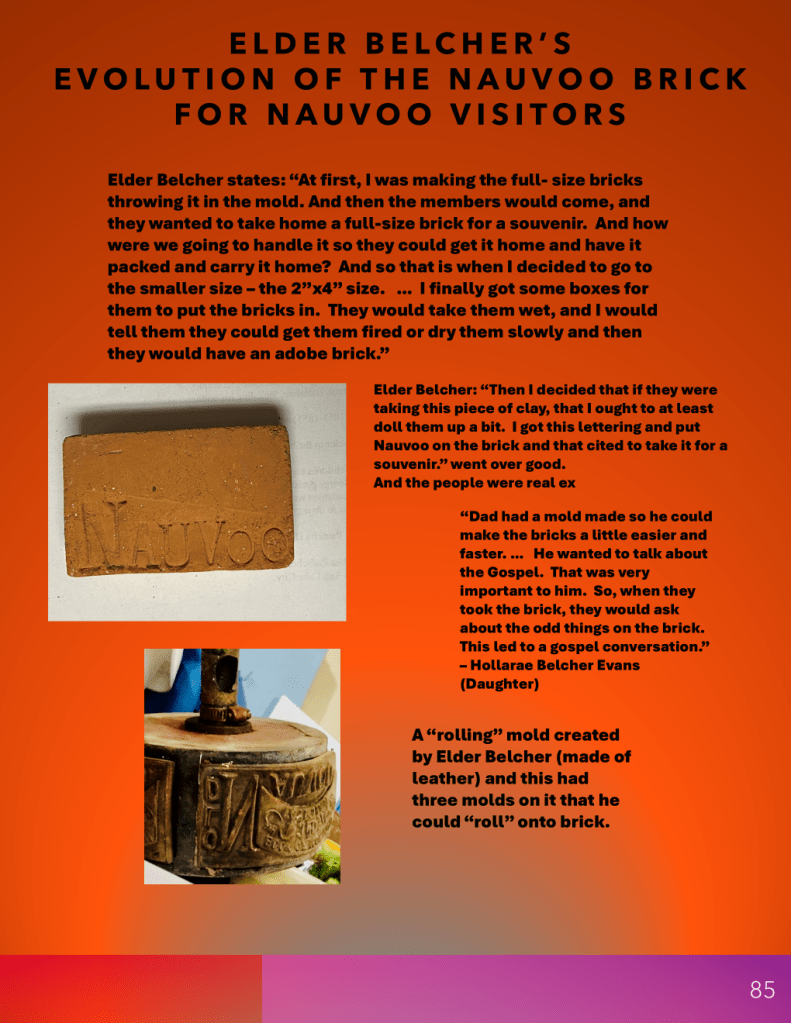 The new brick will make its debut on March 9, 2025. This date was not pre-meditated, but it is a significant miracle that this debut does happen on the 110th anniversary of the birth of Elder E. H. Belcher, the missionary – even “The Nauvoo Brickmaker” – who created the original Nauvoo souvenir brick (yes, the one with word Nauvoo – and the mysterious Egyptian hieroglyphics) back in 1980! So, it is even more exciting that the new brick can honor him in this way – and can maintain the legacy that has been continuing now for 45 years in Nauvoo. What a legacy! Generations of Nauvoo visitors have come through those years and have one or multiple of the bricks proudly displayed in their homes.
