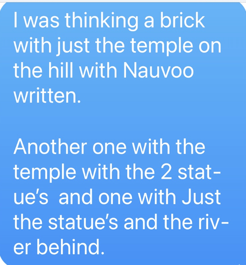 “During the initial call with Kaylea’s parents we got right to work. Mom showed us what she was trying to do on her own and we had a good hard laugh. It looked like the work of a kindergartner. We told her we could definitely help it look better than what she was trying to do. JD got on the computer and started making a blank canvas the size of the current brick. Mom gave us her ideas for some designs. We got on a video call and Mom and Dad told us how they wanted it to look. They texted us pictures they had taken of the Temple and other buildings and statues around Nauvoo to use in Photoshop. JD played around with all the images with Kaylea’s input. Mom and Dad remained on the video call and also gave input. That night we all helped put together 9 different brick samples.