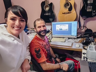 KAYLEA AND JD STODDARD AT WORK ON COMPUTER DESIGN FOR THE NAUVOO TEMPLE BRICK