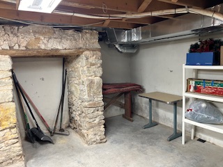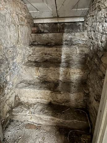 “We then take our guests down into the cellar. Here it gets a bit more interesting. The whole basement has been plastered so it does not look at all 1845’ish. We do show them the original limestone fireplace foundation and they all think that this is so cool. Then our final “Wow” is the stairs that exit up from the basement to the world above (and I think I’ve shared a photo of this in a previous blog).