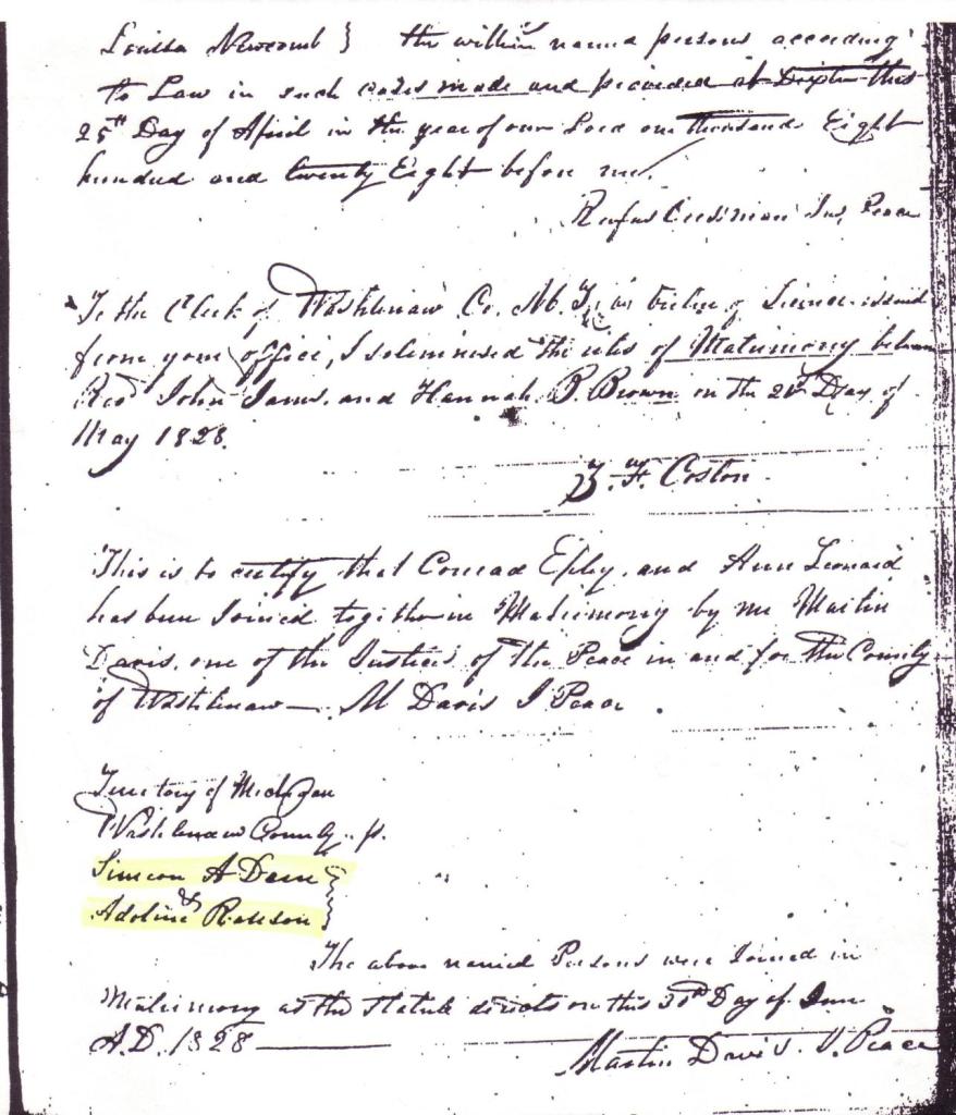 Simeon first married Adaline Rawson. They were married 11 July 1828 at a Washtentaw County, Michigan by a justice of the peace.