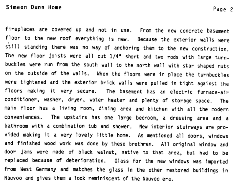 It is not known exactly the process or timetable of the restoration on the Dunn home. The exterior restoration must have begun before 1975 when I arrived first in Nauvoo. Often in the restoration process, porches and building add-ons (after the original Nauvoo era) are removed to return the structures back the “way they were”. Such was the case with the Dunn home. By 1975, the porch and rear additions to the Dunn home had been removed.