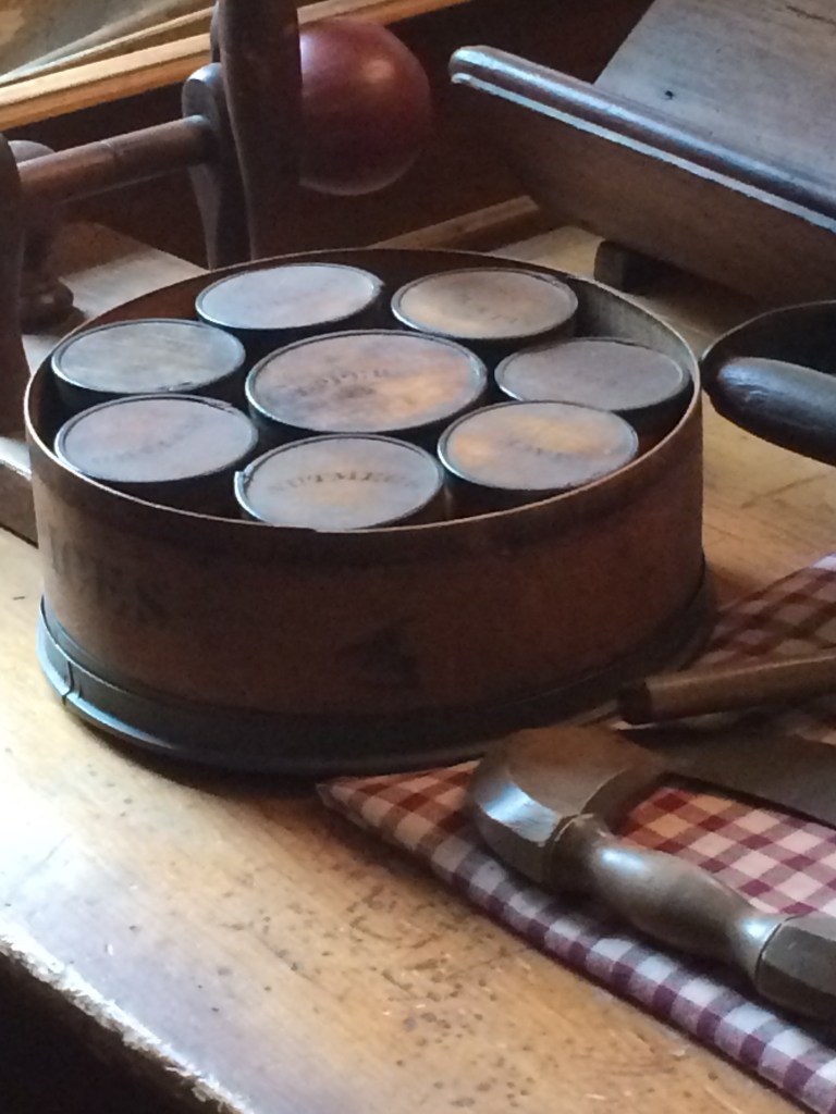 As work was being done in the Dunn home (maybe by Elder Walker?) an old spice can was foun. This is a circular wooden box. The box holds several small cans (also wood) that can contain various spices.
