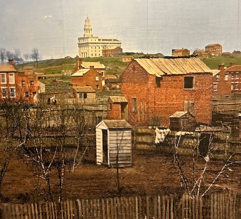 This same view – as seen by the Prophet Joseph, would in 1846 be the location of a now-famous photo looking northeast from the home and included the view of the Nauvoo Temple. This photo also captured the brick “carriage house” and latrine of Lucy Mack Smith. The rare photo is a classic and it has been fun to share it with many guests who come to Nauvoo.