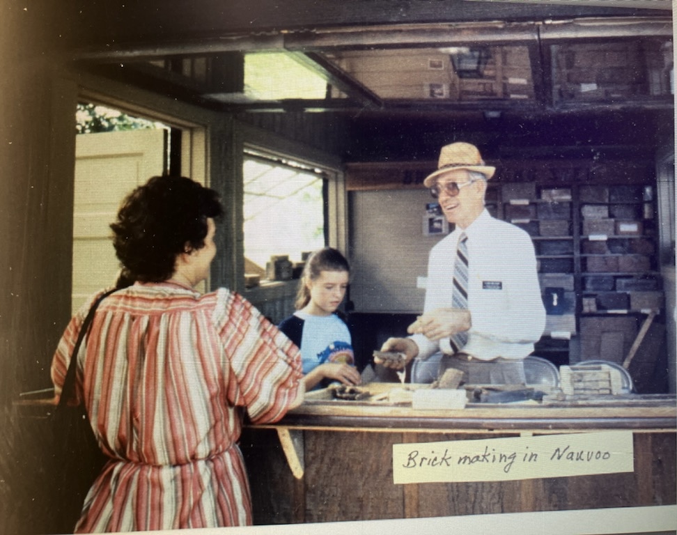 Sister Hunt’s father, Elder Everett H. Belcher served a mission in Nauvoo form 1979 to 1981. During that time, he researched the occupation and art of brick making. He built a kiln and began molding small Nauvoo imprint bricks. These bricks have been handed out to Nauvoo visitors for some 45 years.