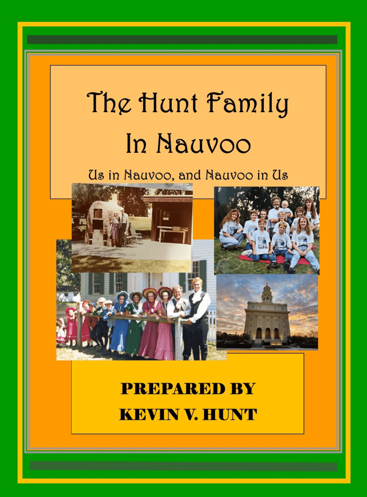 The book title is “The Hunt Family in Nauvoo” and means the family of Kevin and Lou and posterity … but it also means all family on our combined Hunt and Belcher families. We have great Nauvoo heritage on many of our family lines. And in producing this book, the “I” will be my own viewpoint – garnered from years of my journaling, and the “we” will be anyone who was with me/us (“You’N’s”) at any given moment in Nauvoo.