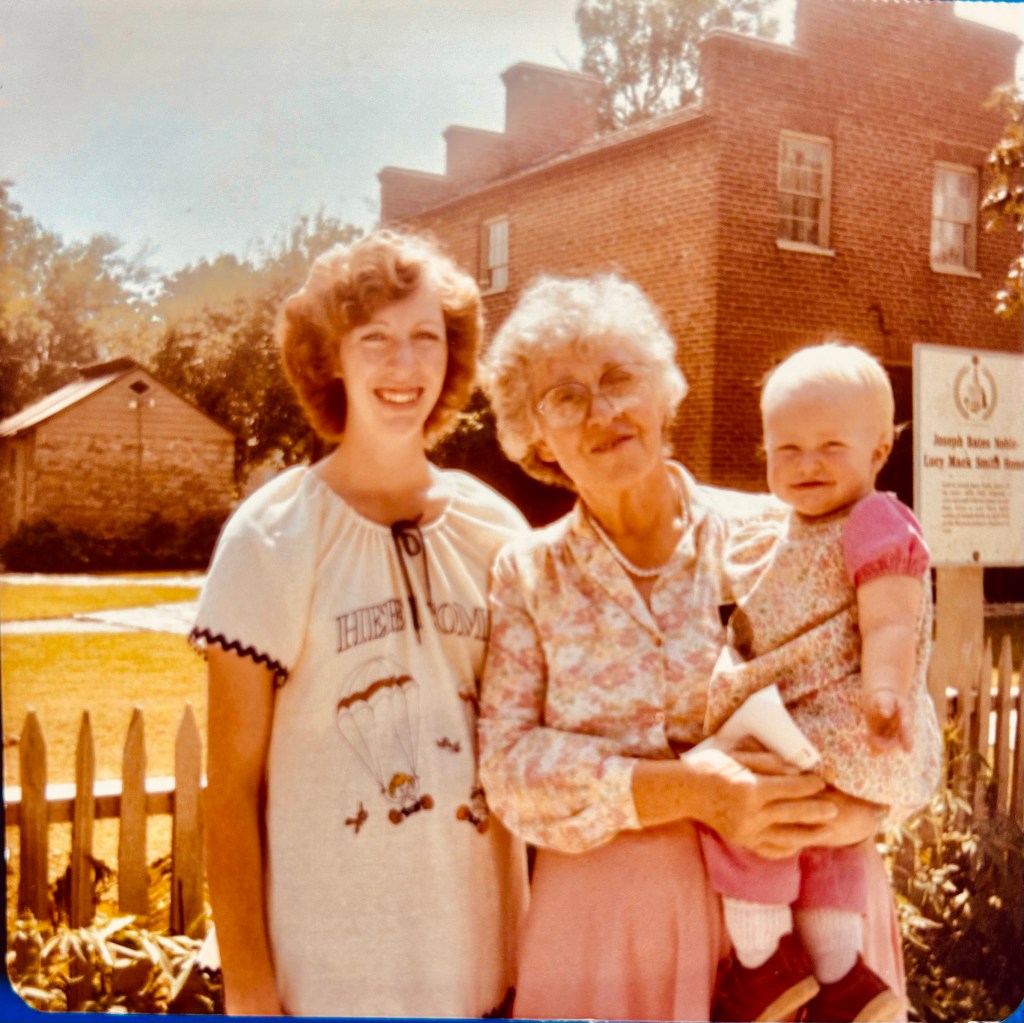 Above: Sister Verna Belcher with daughter, Lou Dene, and granddaughter, Jackie Hunt in Nauvoo 1980