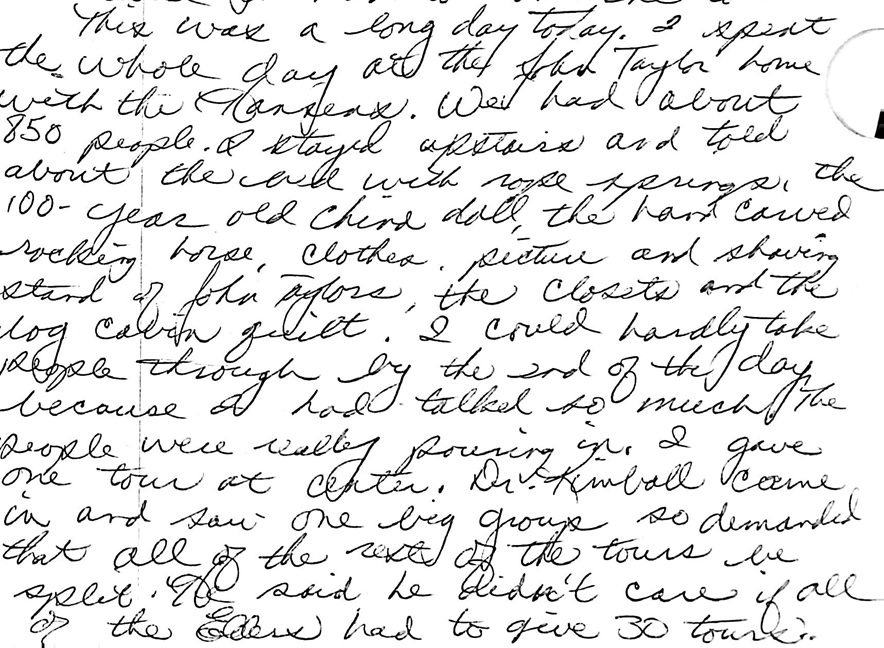 We reported for duty with no real advance preparation, practice or knowledge of Jonathan Browning and we had just a few minutes with the Turners. They were soon off together with our first tour group of the day. They were about half-way through their tour when another big group of guests came in the front door wanting a tour. The Turners kind of went into a panic – trying to figure out what to do and how to handle both groups.