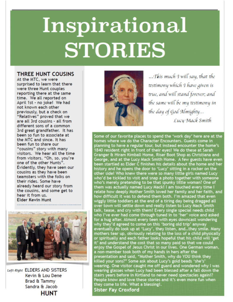 Nauvoo was so wonderful for Sister Hunt (now just “Lou”) and me – and for our families that we want to keep hanging on to that special Spirit of Nauvoo for as long as we can. It is now and will forever be a part of us … deep in our hearts and souls. And we want our children and their children to remember Nauvoo also … the special times and adventures – and the Spirit that we all enjoyed together in Nauvoo.