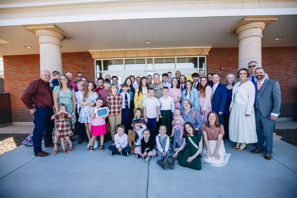 After the meetings, we gathered our family out to the east side of the building. We had Kaylea take a plethora of photos of the big group and then family groups with Lou and me. Kaylea is a great photographer and always does a great job. It was fun being there with the group.