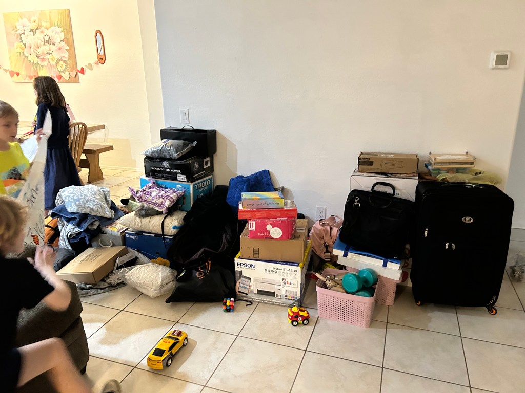 We had so much “stuff” and only our mini-van (pioneer wagon) to haul all of the stuff home. I had to use all of my best skills to accomplish the task. I began by putting Lou’s Bosch, her sewing machine, and a newly acquired mixer that she just got from the D.I. – onto the floor of the van – between the second and third row seats. I then put one of our two 4’ tables. I put this atop of a couple of shrunk bags of clothing – to make the table sit flat. On this table, I put a board painting that Jenae started a while ago – about Jesus and children. I put a couple of other poster size photos. I then put the second table on top of these items. I packed towels and other soft stuff around the kitchen items – to secure them tightly. My computer printer – in a large cardboard box came next.