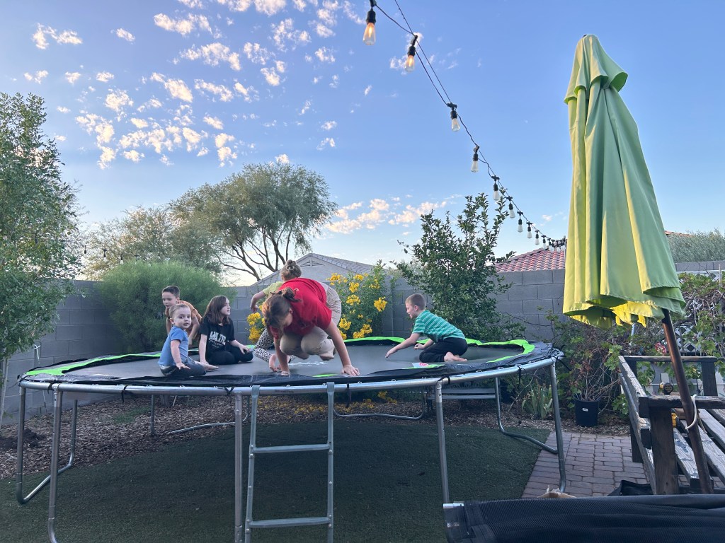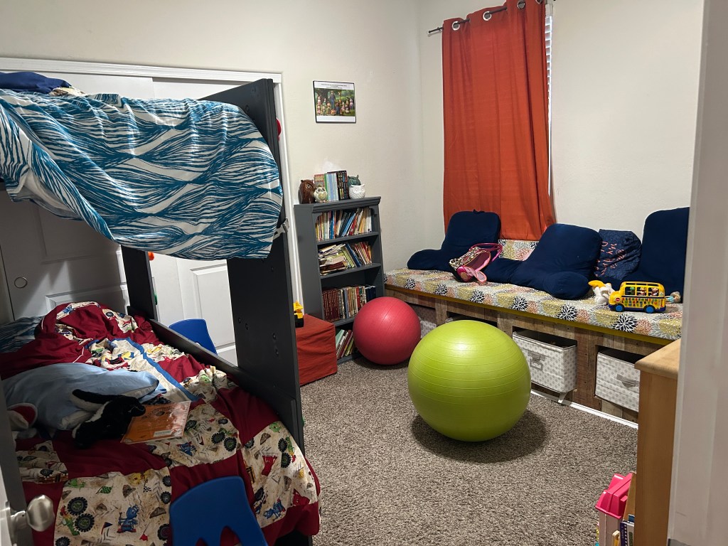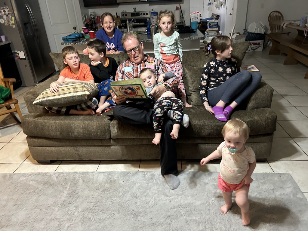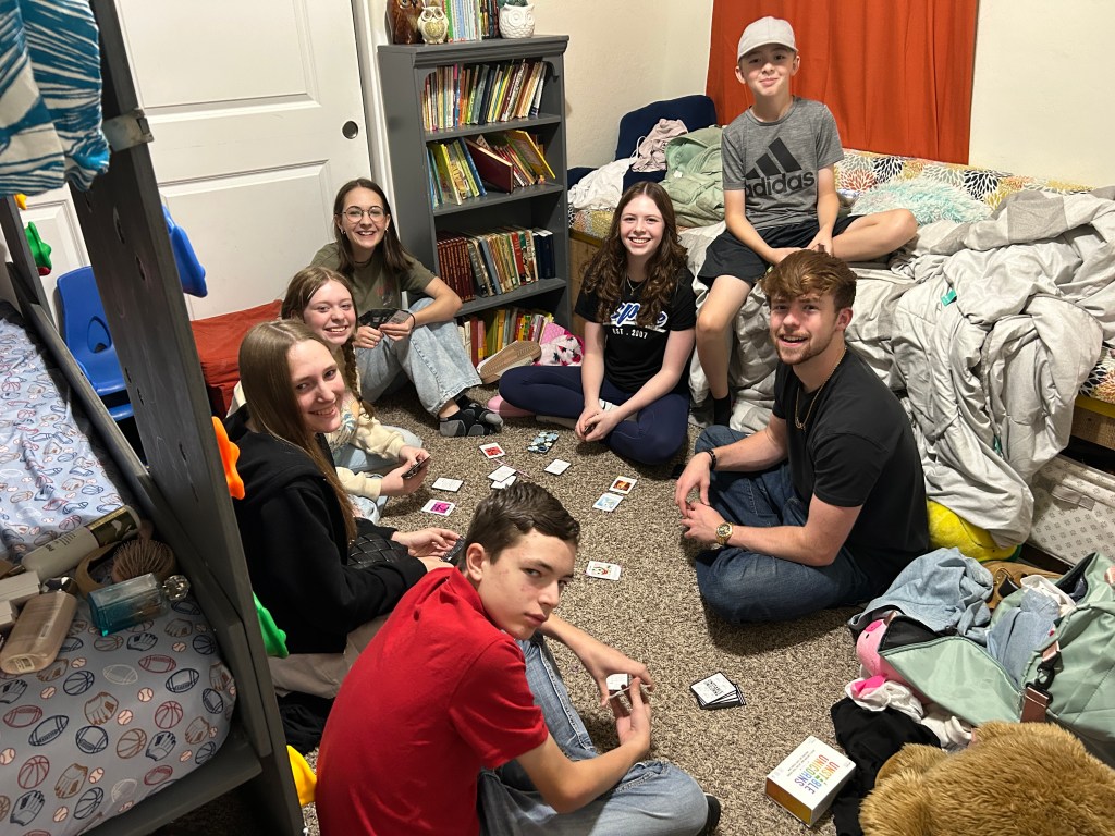 Jenae and Brianna came home with us. Brianna and Lucy and Elsie put together a sleepover. Their plan was to hang out together in the grandkid room (where we have the “Murphy Bunk Beds” and the reading bench (that had a sleeping pad). Kaylea and JD and the other boys came a while after we got home. JD and the boys went on a food trek to McDonald’s and got dinner (since they had missed out on the pizza). Larissa came back over to just hang out with the family.