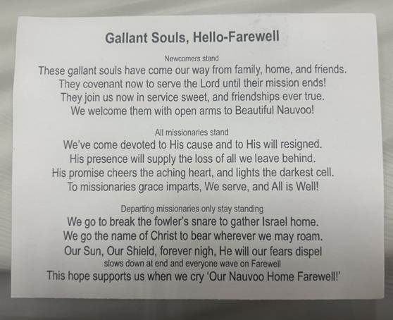Then as we served in 2024 a senior sister missionary composed a new song – sung to the tune of the old “Mormon” song, “The Gallant Ship”. (This song was composed by the great Latter-day song writer, even William W. Phelps, and was sung by foreign Saints as they prepared to leave their native lands for Nauvoo and the hymn even appeared in Emma Smith’s “Sacred Hymns” 1835 hymnbook. Here is a link to the old Mormon era favorite: