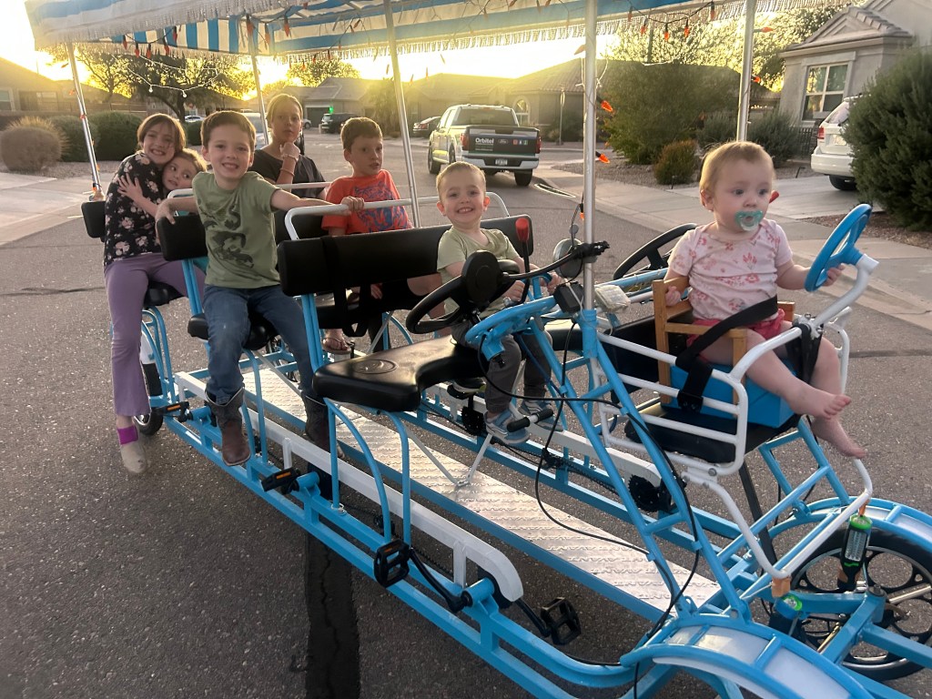 I recruited Brodey as the commander of the quadricycle bike unit. On the given signal, most of the grandkids rushed out for rides. Brodey and Dallin rode in the front seat. And they filled up the rest of the seats with the cousins. There were more folks than the unit would hold at one time. The kids had fun riding and pushing the unit. Brodey took the kids around the “short block”.