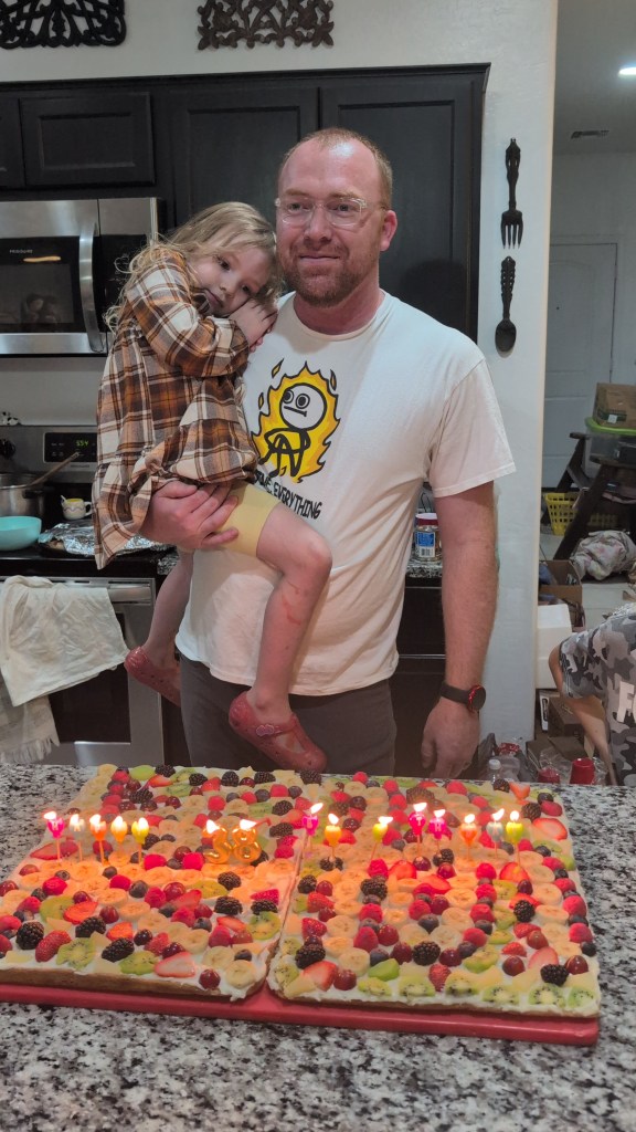 As noted, this was Keith’s birthday. So, for his occasion, Kayla made several large “fruit pizzas” for our dining enjoyment. This was wonderful. I love this crust covered with various kinds of fruit – and a cream topping of some kind.