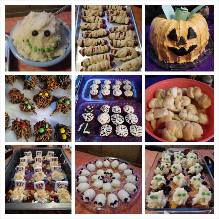 After the meeting, Rusty led many of the men in setting up tables and chairs for a luncheon. Many people – including Lou – worked to finalize their food contributions. We all brought various “spooky items”. It was fun to see what everyone came up with. We had quite a variety. My favorite was a big pan of pulled pork that Rusty brought. He had a skull and bones crawling out of the pan. Very creative.