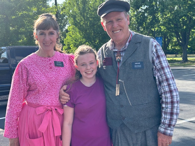 Everyone was invited to wear their best 1840’s vintage costumes. I wore brown pants, a tan colored vest with my pocket watch, my 1997 “City of Joseph” costume white shirt. Lou also made me a blue cravat tie that matched her new blue dress. She just recently created this new blue dress – with a pink apron. She looked beautiful.