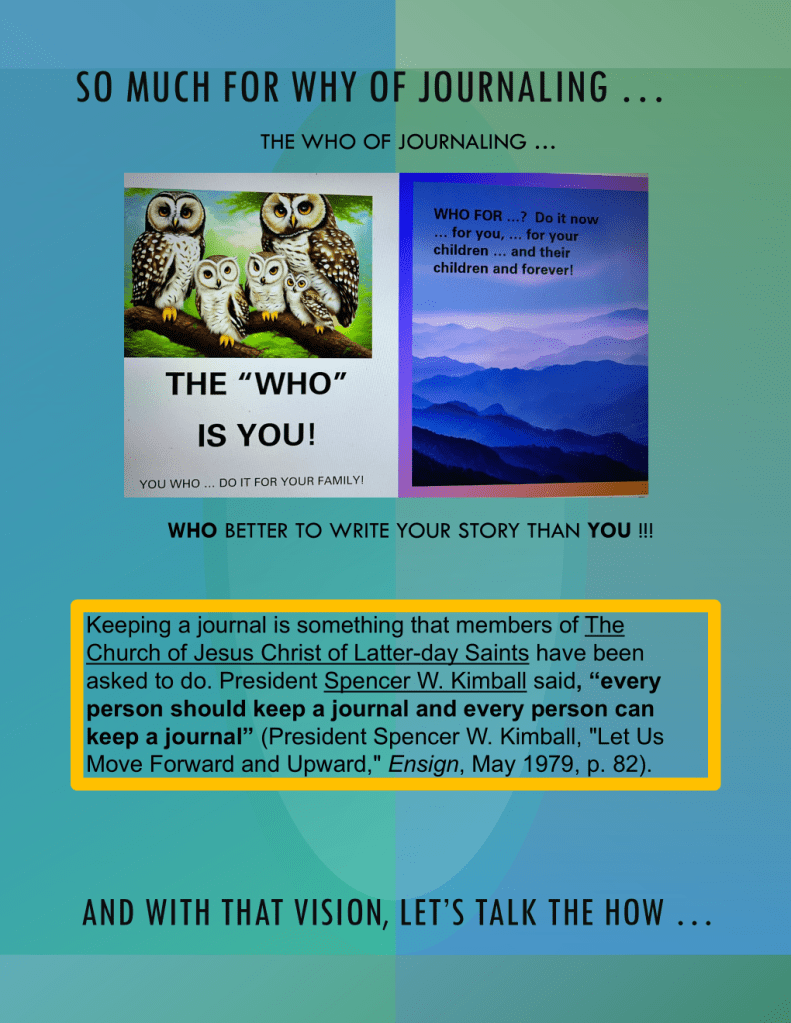 During the winter months of 2025, I volunteered to teach a series of five different classes on the subject of heirlooms, journals, personal and family histories and how to publish them. For each class, I created a PowerPoint presentation. Each of these presentations were later posted on my blog site.
